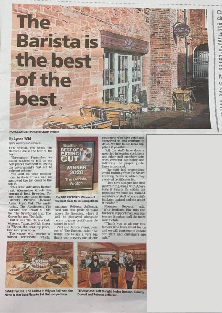 We are proud to announce that The Barista was voted the winner in the News & Star Best of the Best Eating Out 2020 Competition